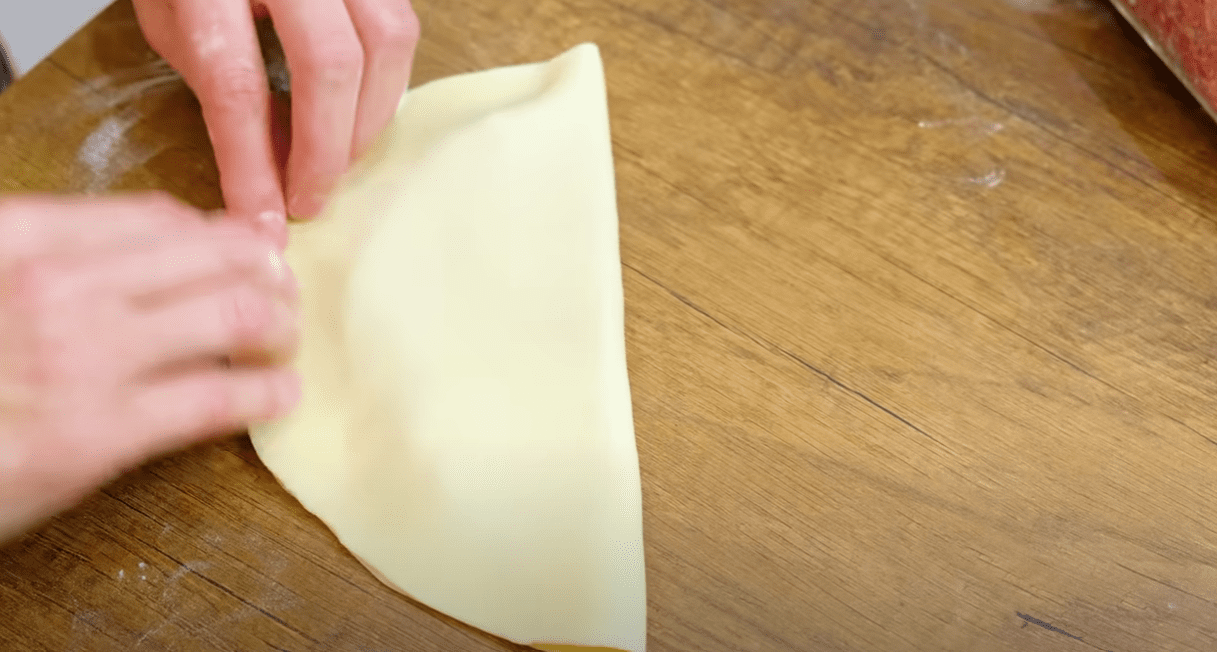 Далі дістаємо тісто і поділяємо його на 8 рівних частин. Спочатку формуємо кульки, а потім розгортаємо їх за допомогою качалки дуже тонко. На половину розкатаного тіста викладаємо 1 столову ложку фаршу. Закріплюємо та фіксуємо краї. Це можна зробити за допомогою тарілки та закріпити вилкою.