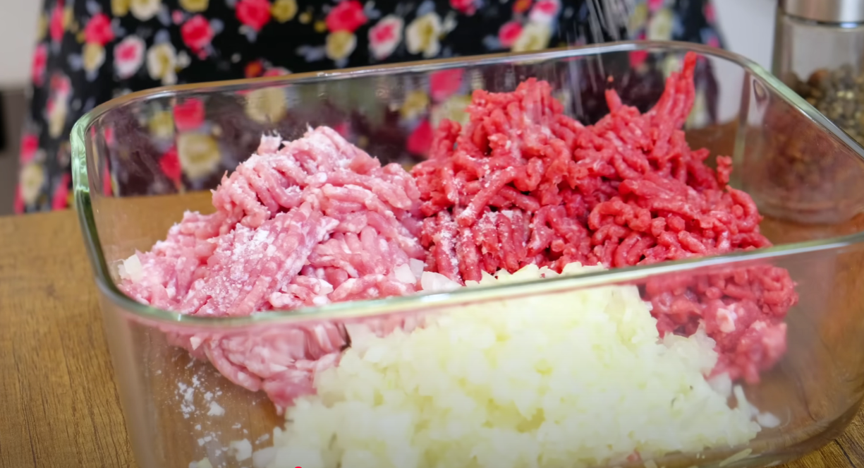 Далі займемося фаршем. У цьому рецепті фарш готували самостійно, але ви можете використовувати покупний. Головне, щоб він був якісним. У фарш додаємо дрібно нарізану цибулю, сіль та перець за смаком. Для соковитості можна додати трохи води.