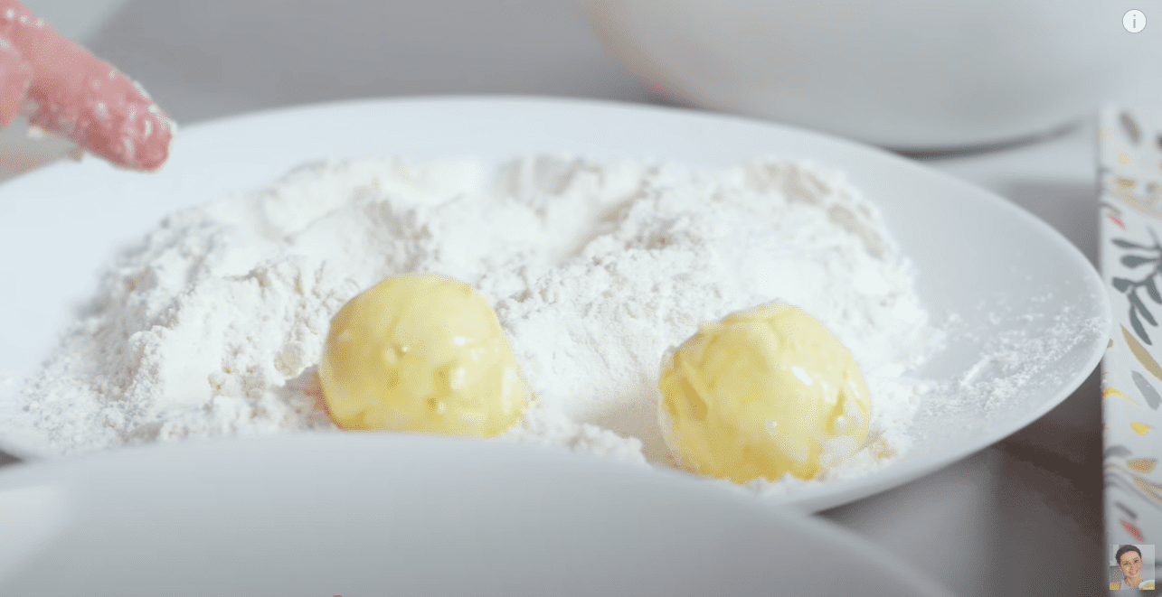 Беремо 0,5 столової ложки начинки, викладаємо в муку і формуємо руками невелику кульку. Потім перекладаємо його в суміш з яйцем і акуратно перевертаємо, щоб яйце рівномірно покрило всю сирну кульку. Потім відправляємо його знову на борошно. Так можна зробити кілька разів.