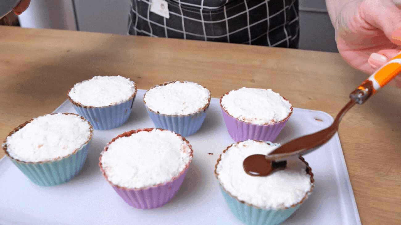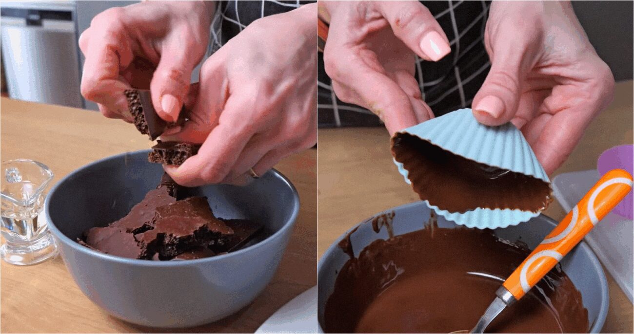 Після цього потрібно взяти будь-які силіконові форми (наприклад, для кексів) та гарненько змастити їх розтопленим шоколадом. Щоб це було зробити зручніше, бажано, щоб форми були порційними. Для рівномірного розподілення шоколаду у формі налийте невелику кількість та покрутіть, щоб тонкий шар залишився на дні та стінках. Надлишок злийте назад у миску. Формочки поставте на 20 хвилин у морозильник для застигання шоколаду.