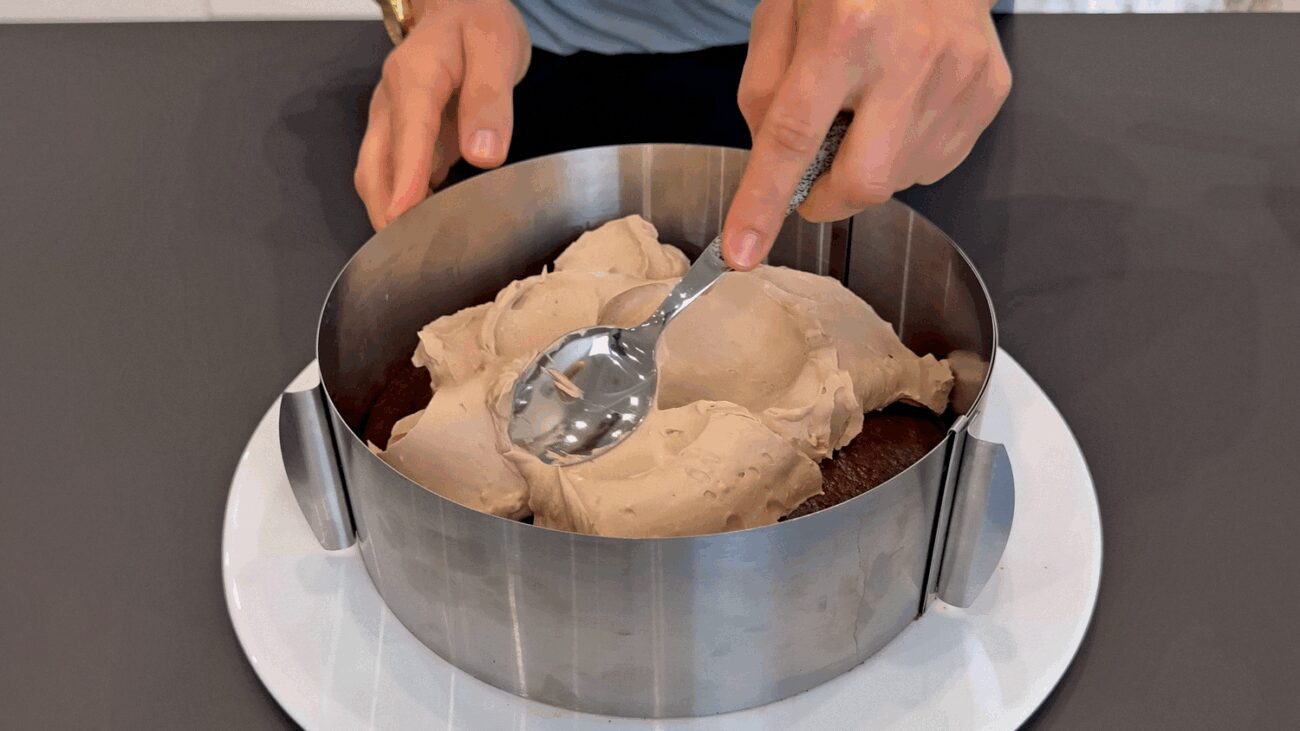 Вилийте тісто в змащену маслом та присипану борошном форму. Поставте форму у розігріту до 175°C духовку на 20 хвилин. Тим часом можна зайнятися кремом. В окрему миску влите 200 мл жирних вершків та збийте до легкої густоти. Туди ж додайте 125 г маскарпоне та 2 столові ложки горіхової пасти. Збийте все до однорідності.