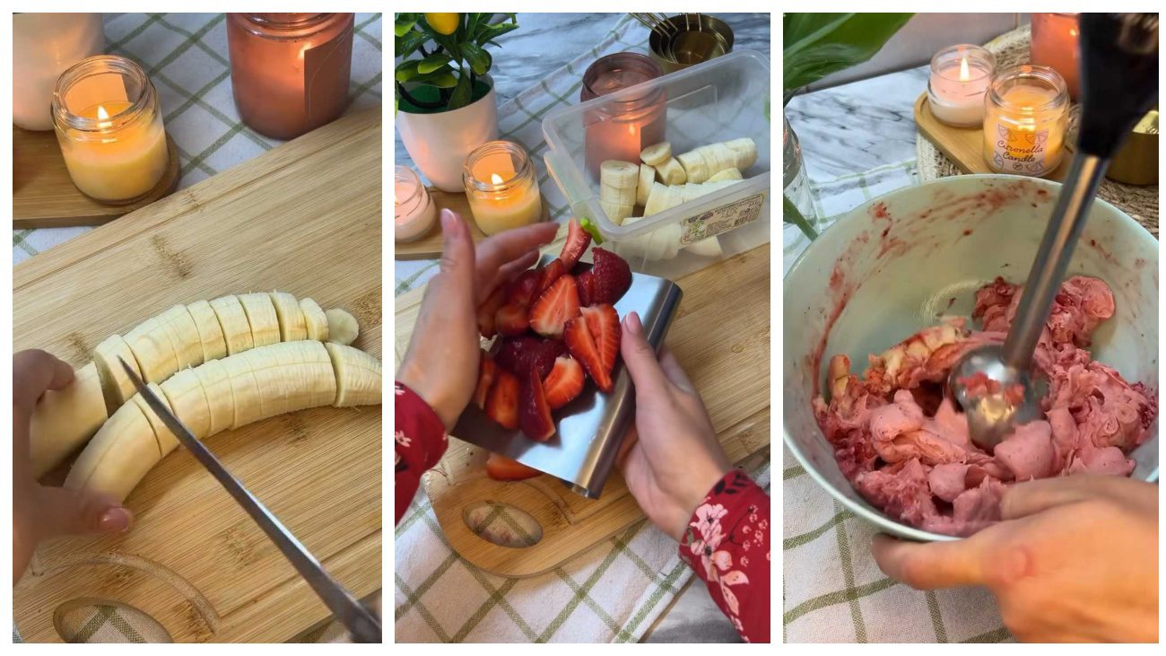 Для того, щоб приготувати домашнє та натуральне морозиво, господиням потрібно мати два банани, 150 грамів полуниці та 30 мілілітрів молока. Після цього, можна одразу ж переходити до справи. Перше, що слід зробити, це нарізати банани на тонкі кругленькі шматочки й скласти їх у контейнер для зберігання їжі. Туди ж додати порізану полуницю, або ківі. Контейнер варто закрити кришкою та поставити в морозильну камеру. Фрукти повинні добре замерзнути.