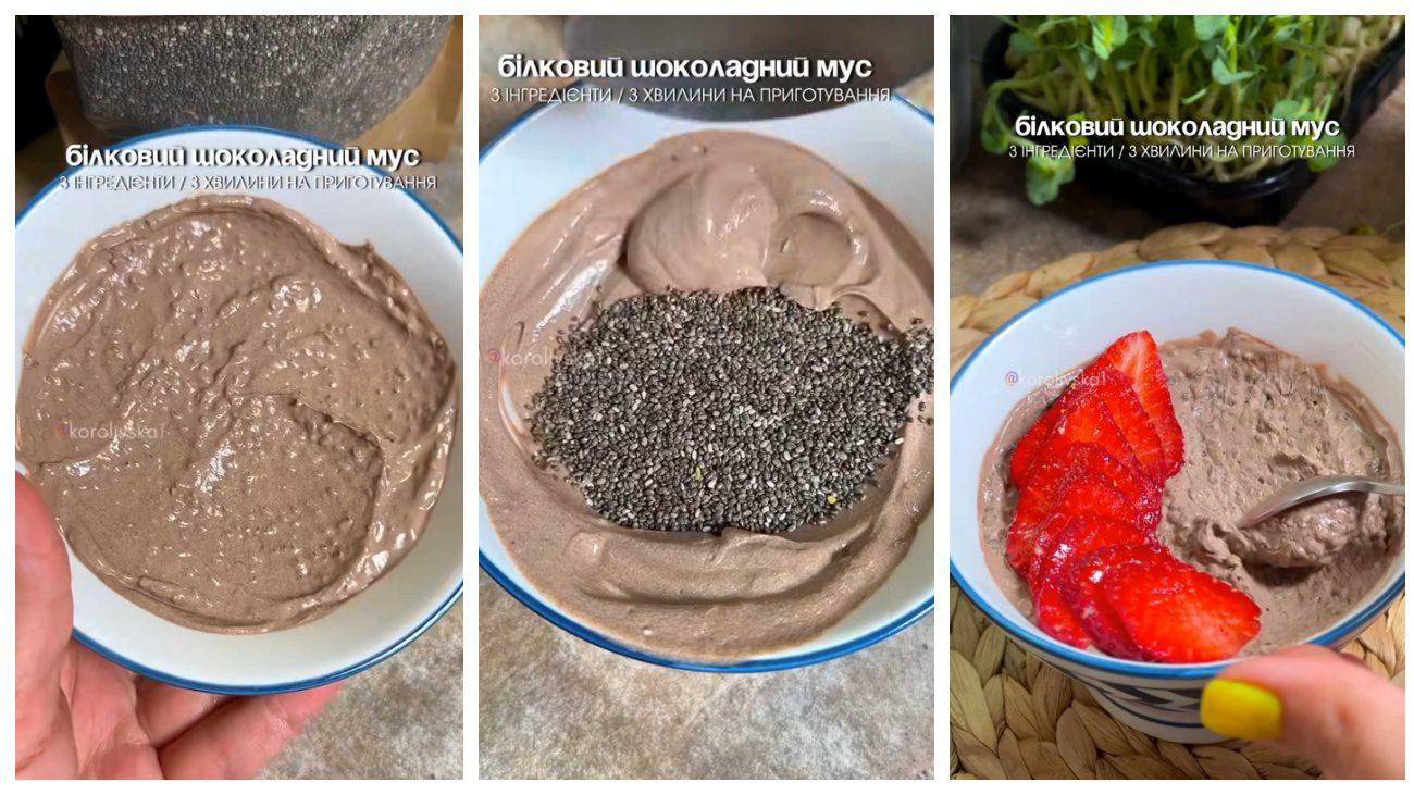 Для того, щоб приготувати такий мус, господиням знадобиться 300 грамів грецького йогурту, три столові ложки насіння чіа та дві-три столові ложки какао. За потреби можна ще додати підсолоджувач за смаком. Все, що варто зробити, це змішати всі ці інгредієнти в єдину суміш, а потім поставити в холодильник на 1,5–2 години часу. І смачний десерт буде готово! Такі перекуси можуть неабияк допомогти, коли хочеться їсти, а готувати немає ні сил, ні часу. Також, саме такий десерт можна сміливо поїсти перед сном. Від нього точно не виросте ні живіт, ні жир на “боках”.