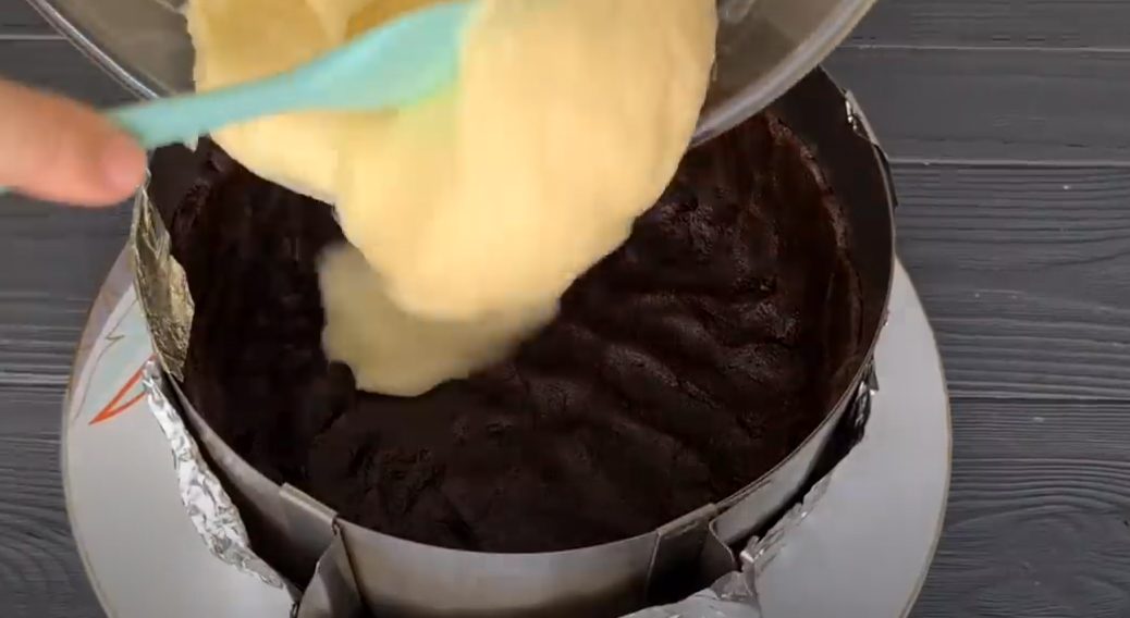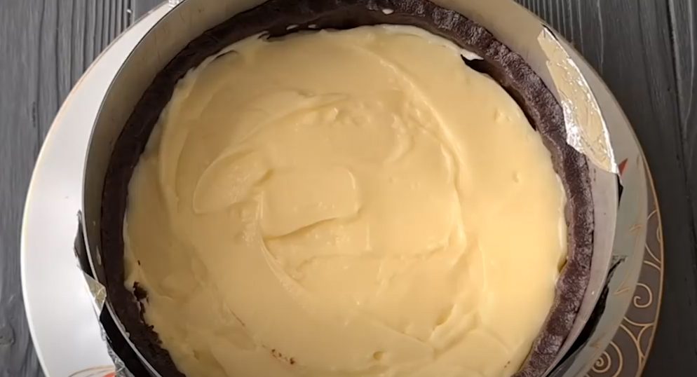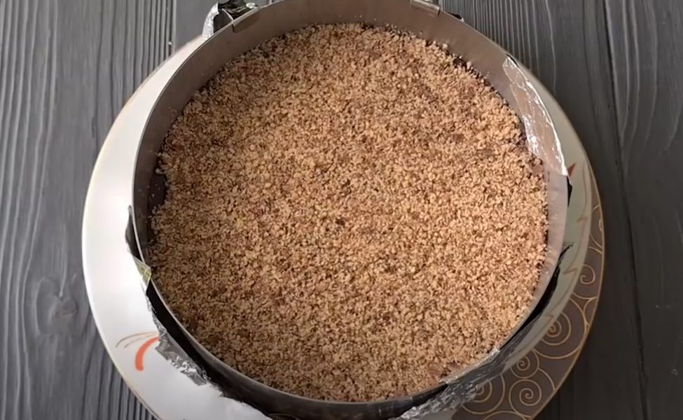 Розімніть тісто руками. Перекладіть у роз’ємну форму, низ якої викладіть фольгою. Сформуйте пласке дно та бортики по боках. Влийте крем. Розрівняйте. Зверху присипте подрібненими волоськими горіхами та натертим на тертушці шоколадом.