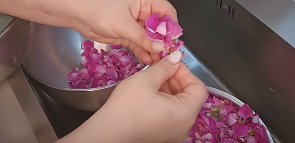 Промийте їх та обріжте білі кінчики. Дайте сировині добре просохнути. З них ми й будемо варити варення. Спочатку закип’ятіть воду. Потім розчиніть в окропі цукор. Коли повністю розчиниться, додайте рожеві пелюстки.