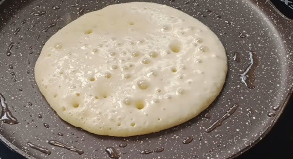 Далі формуємо на поверхні гарячої сковороди рівні млинці. Тісто має бути товщиною приблизно в 1 міліметр. Ці млинці не такі тонкі, як класичні. Вони почнуть показувати пухирці, але майте на увазі, що обсмажуються ці млинці лише з однієї сторони.