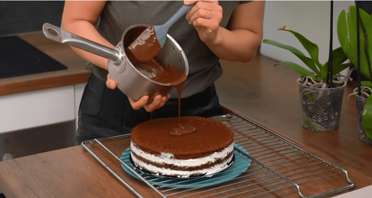 Гарячою глазурью заливаємо торт. Готовому торту потрібно постояти в холодильнику кілька годин для стабілізації.