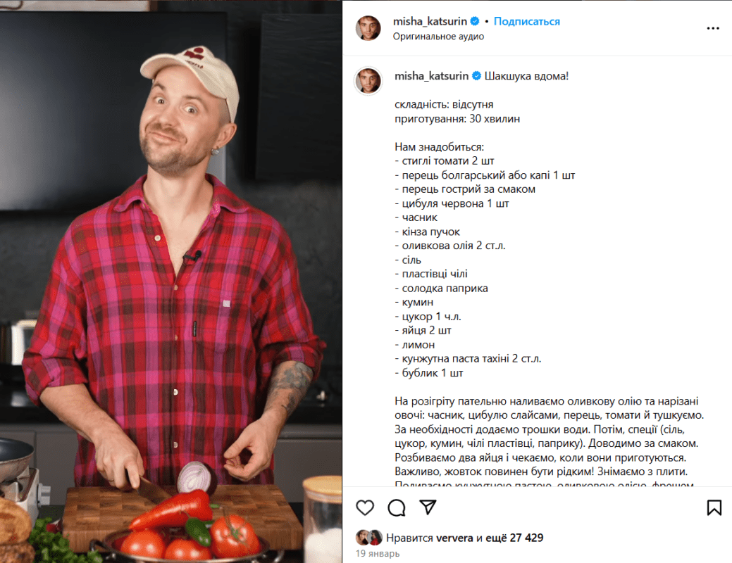 Чоловік популярної української співачки Наді Дорофєєвої блогер та ресторатор Михайло Кацурін вже давно веде сторінку в Інстаграм, де розповідає про їжу та ділиться безліччю оригінальних рецептів, які готує у себе вдома. Нещодавно знаменитість показав, як приготувати сирники “Три молока”, а нещодавно поділився рецептом справжньої “шакшуки”.