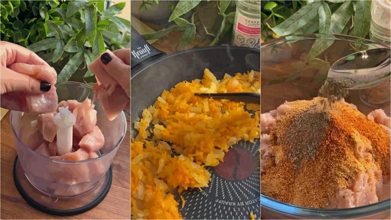 Одну морквину потрібно почистити та натерти на великій терці, цибулину — нарізати невеликим кубиком. Обсмажте овочі на невеликої кількості олії до м’якості. Після цього змішайте їх з курячим фаршем. До тієї маси додайте 50 г панірувальних сухарів, улюбленої зелені (петрушка, кріп, кінза), столову ложку сметани й спеції. Останні можна брати будь-які. База — сіль, а крім неї можна кинути перець, сушений часник, копчену паприку тощо.