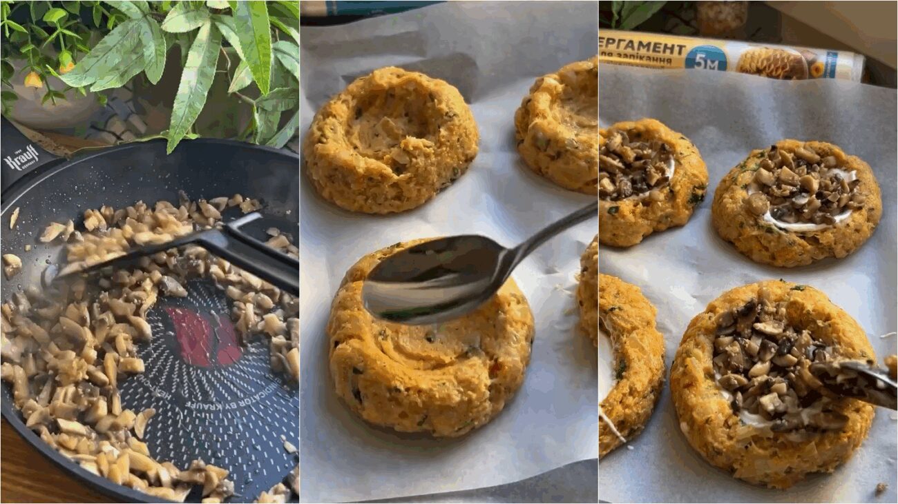 Для начинки треба купити будь-які свіжі гриби. Можна обійтися звичайними печерицями. Але якщо знайдете лісові гриби, то страва вийде в рази смачнішою та ароматнішою. Обсмажте гриби до готовності, трішки підсоливши їх та додавши трішки перцю і сушеного часнику для ароматності. Після цього дно кожного гнізда змастіть сметаною, а зверху викладіть грибну начинку. Зверху посипте все сиром, щоб після запікання вийшла рум’яна скоринка.