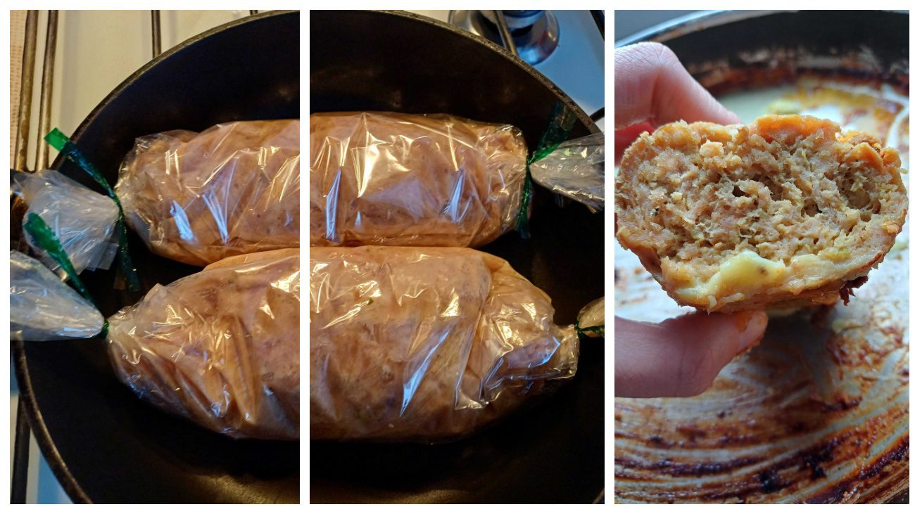З самого початку може здаватися, що молока буде забагато. Насправді ж, фарш усе дуже добре в себе вбере. При цьому, м’ясо стане більш м’яким і не буде таким густим і щільним. А тому, вкладати його у рукав для запікання, щоб сформувати ковбаску, буде простіше. Робити велику, середню чи маленьку ковбасу, кожен повинен вирішувати сам! Буде так, як людина зможе поділити й порізати рукав для запікання. Чим більший шматок плівки, тим ковбаса буде товщою і ширшою!