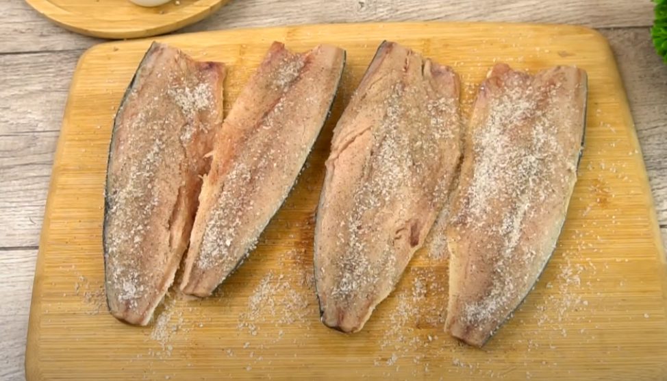 Щоб приготувати рибне сало, тушки скумбрії розморозьте. Приберіть голови та нутрощі. Тушки розріжте навпіл і витягніть хребти. Складіть у миску та присипте сіллю, цукром та чорним перцем. Перемішайте суміш із рибою, щоб просоталися шматочки з усіх боків рівномірно.