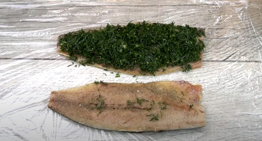 Кріп вимийте, просушіть і наріжте дрібненько. Обчищені зубці часнику подрібніть за допомогою пресу. Змішайте та залийте нерафінованою олією. Одну половинку філе щедро намастіть зеленою сумішшю та накрийте другою половинкою.