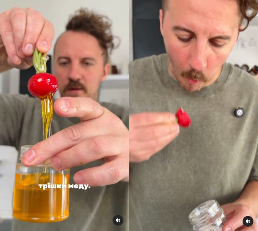 Не поспішайте хапатися за голову, оскільки в арсеналі у Євгена є ще екзотичніші поєднання. Зокрема, це редиска з медом. Всі, хто скаржиться, що кольоровий овоч занадто гіркий, шеф-кухар пропонує вмочити коренеплід у слоїк із медом і скуштувати. Вийде зовсім інший, ні на що не схожий смак.