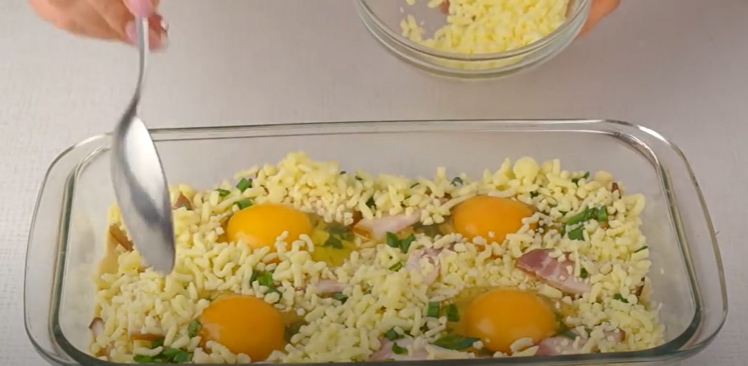 Акуратно вбийте яйця. Перекладіть їх рештою бекону. Духовку увімкніть завчасно, щоб вона на цей момент уже розігрілася до 220 градусів. Відправте форму туди. За 15 хвилин, коли білок схопиться, страва буде готова.
