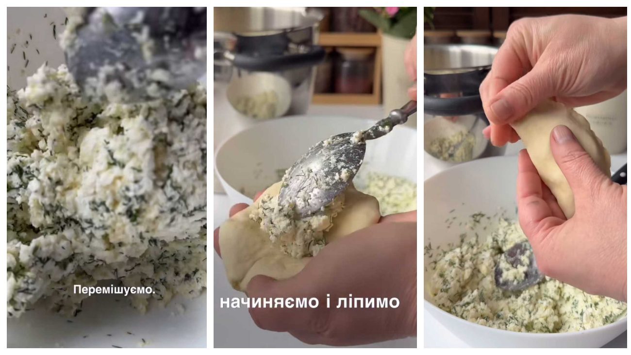 Перше, з чого варто почати, так це з того, що слід змішати всі інгредієнти для тіста й фактично замісити його. Воно повинне вийти м’яким та еластичним. Відпочивати його слід залишити на годину-півтори, щоб воно як слід піднялося. За цей час можна сміливо встигнути приготувати начинку. Для цього потрібно змішати сир з цибулею, сіллю, яйцем та зеленню.