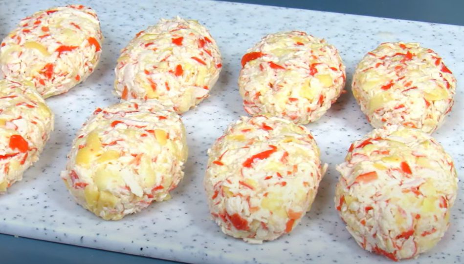 Додайте борошно і ще раз перемішайте крабовий фарш. Сформуйте 10 котлет. Робіть це вологими руками, щоб маса не прилипала до рук. Тепер настала черга панірування. В одну мисочку насипте борошно.