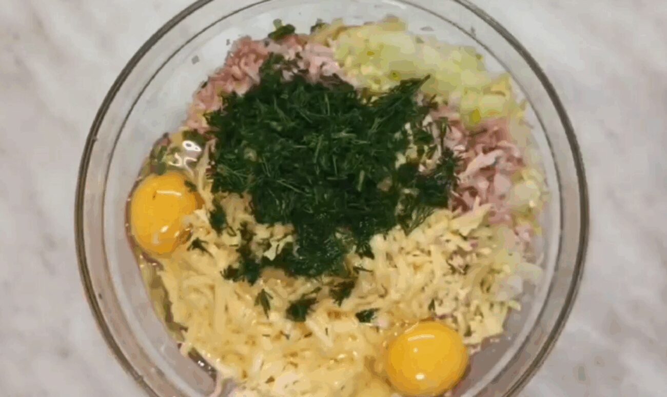 Шинку та твердий сир також потрібно натерти на крупну тертку і додати до картоплі. Туди ж відправляємо дрібно нарізаний кріп, 2 сирих яйця, сіль, перець та борошно. Все потрібно добре змішати до однорідності.