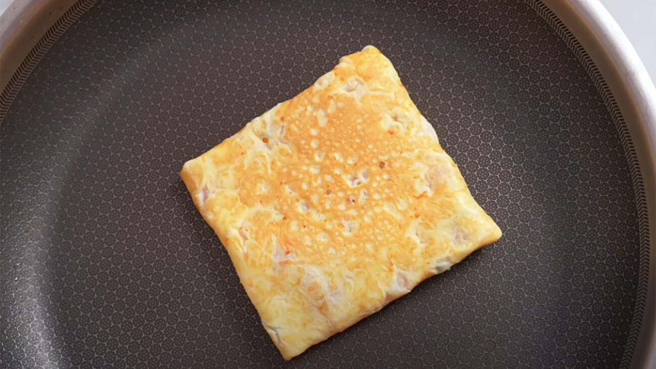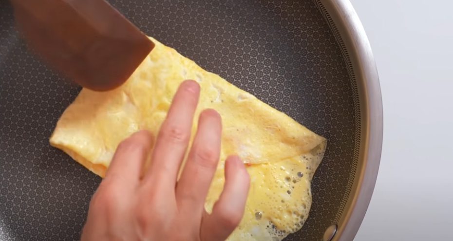 Розігрійте пательню. Влийте крапельку олії. Рівномірно розподіліть жир по всій поверхні за допомогою серветки. Вилийте яйце. Покрутіть сковорідкою, щоб маса розтеклася по всій сковорідці тонким шаром.