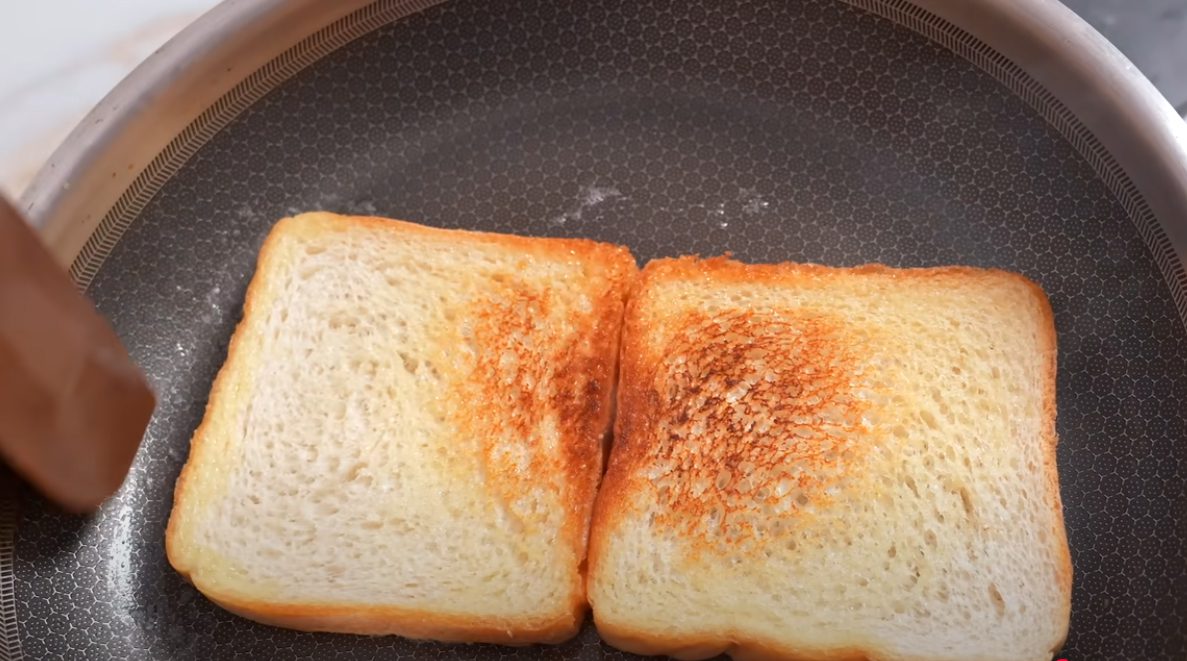 Тепер на сковорідці розтопіть шматочок вершкового масла. Викладіть хліб та підсмажте з обох боків. Шматочки тостів намастіть кетчупом, а зверху викладіть яєчні конвертики. Сніданок готовий.