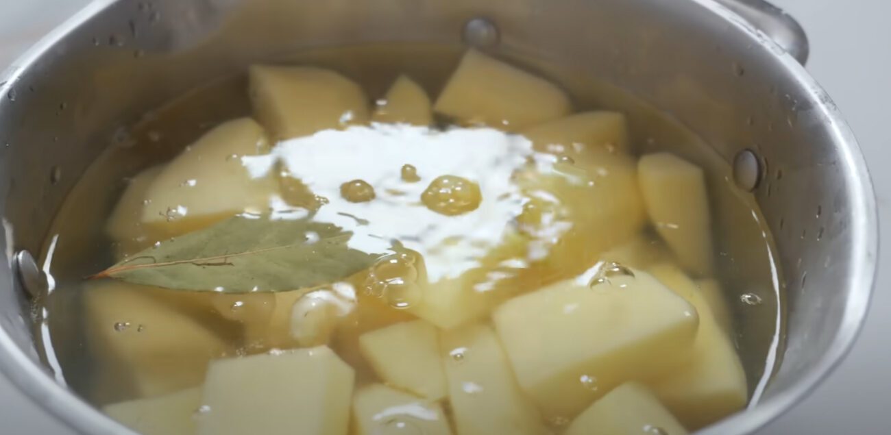 Залийте окропом і поставте на вогонь. Коли закипить, вогонь прикрутіть і варіть до готовності не дуже довго, бо це ж молода картопля. Хвилин 15-20 буде достатньо. Тим часом приготуйте заправку.