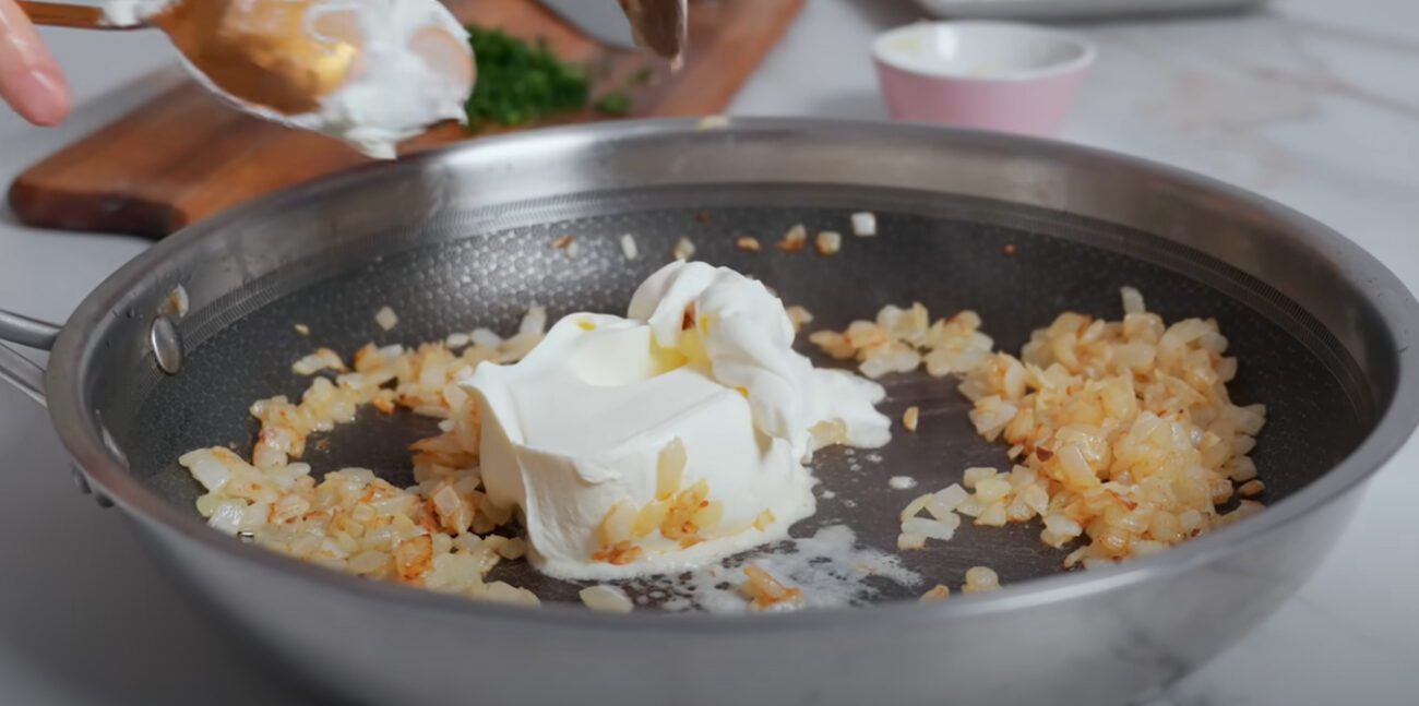 Обчищену цибулину наріжте дрібними кубиками. Обсмажте на вершковому маслі, яке можете сміливо замінити олією. Коли зарум’яниться, додайте борошно. Перемішайте та обсмажуйте ще протягом хвилини.