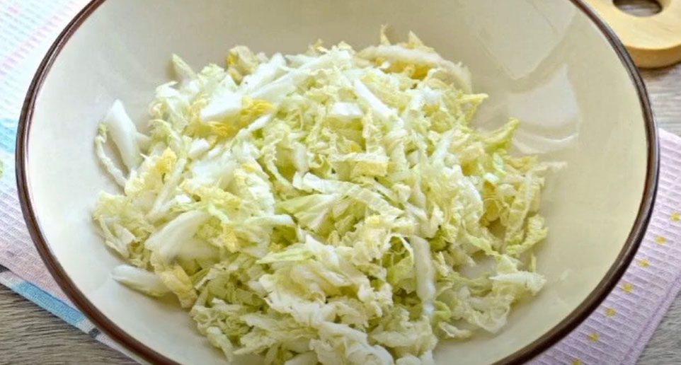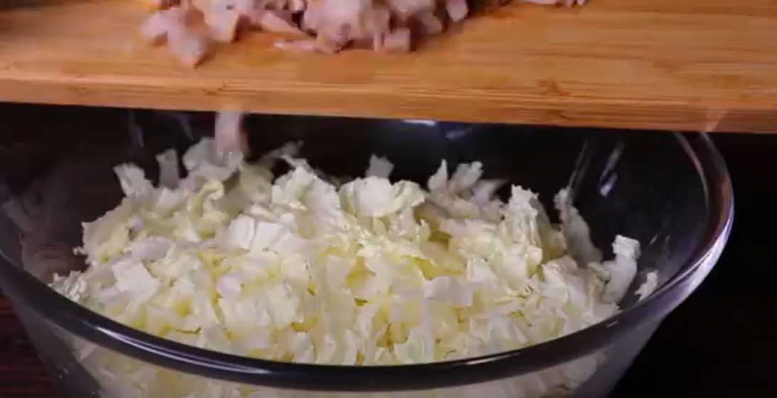 Пекінську капусту позбавте твердої серединки, а м’які листочки наріжте не дуже тоненькою соломкою. Стегенце позбавте від кісточки та наріжте на кубики. Змішайте 2 основних інгредієнти.