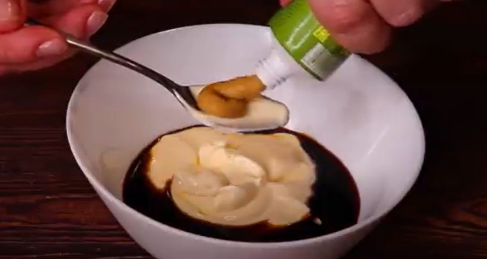 В окремій мисочці з’єднайте соєвий соус, майонез та гірчицю. Зубчик часнику обчистьте та пропустіть крізь прес. Ретельно перемішайте до однорідності. Заправте наш салат отриманою заправкою. Перемішайте та подавайте до столу.
