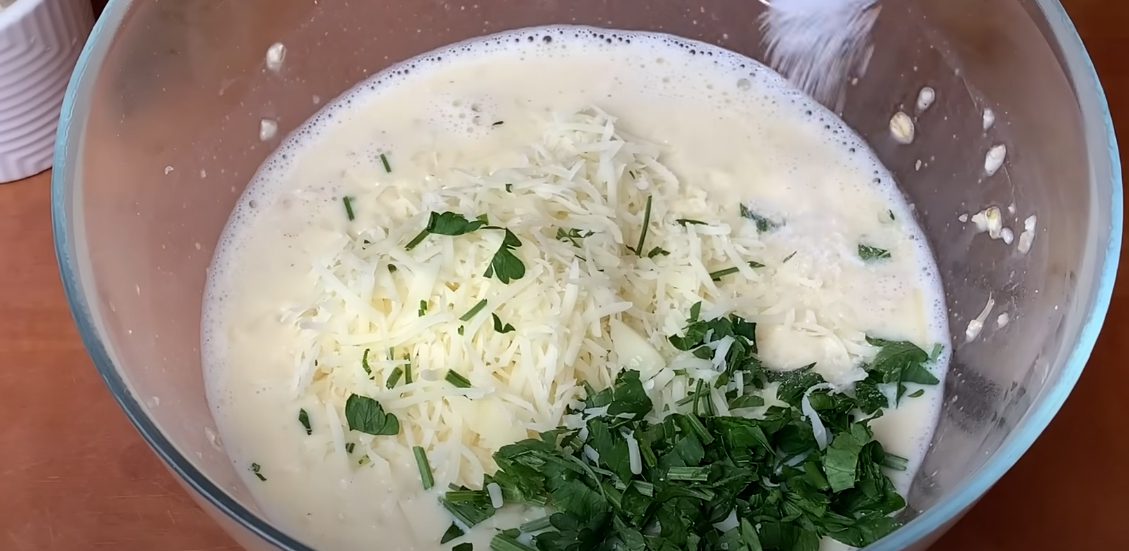 Ретельно перемішайте масу. Відставте на 5 хвилин, щоб пластівці набубнявіли. Тим часом подрібніть зелень петрушки, попередньо вимивши. Твердий сир натріть на середній тертушці.