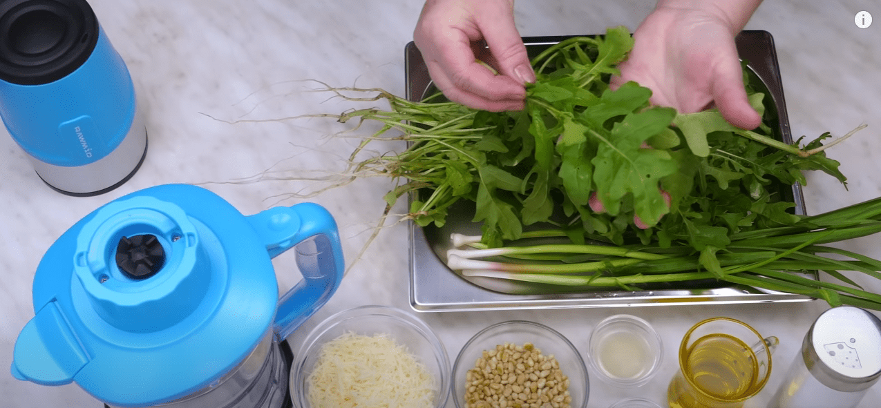 Спочатку потрібно обірвати листочки руколи. Помити та злегка обсушити. Відправляємо їх разом із часником у блендер. Туди ж насипаємо тертий сир пармезан (можна вибрати будь-який із твердих сирів), але якщо хочете полегшену пісну версію Песто, сир можна не додавати.