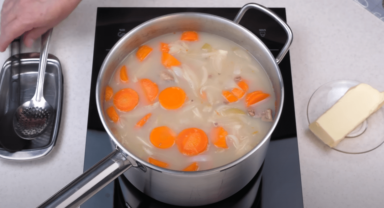 Потім зніміть каструлю з плити та злийте всю рідину. Поки продукти ще гарячі, додайте вершкове масло.