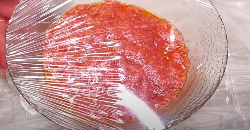Полийте зверху олією. Розрівняйте та затягніть харчовою плівкою, щоб м’ясо не звітрилося. Відправте до холодильника на 24 години. Коли фарш замаринується, дістаньте й додайте цибулю, нарізану дрібними кубиками.