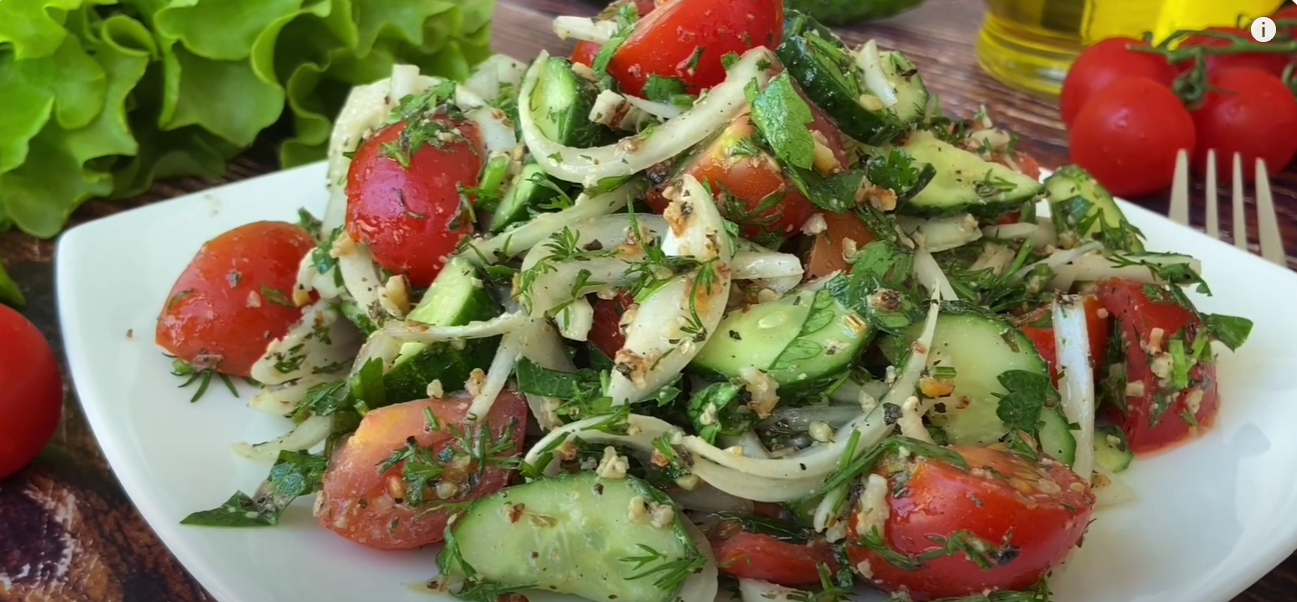 Цей салат по праву займає своє місце серед улюблених літніх страв. Вся справа в дуже смачній горіховій заправці, яка надає йому пікантного смаку. Цей салат є чудовим доповненням до м’ясних страв та шашлику, тому його часто готують на пікніках.