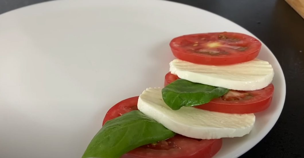 Сир моцарелу теж наріжте тонкими пластинами. Викладіть на круглій тарілці інгредієнти, чергуючи шматочки сиру й томатів та перекладаючи листочками базиліку. Тепер беріться до приготування заправки. Вся фішка цієї страви полягає саме в ній.