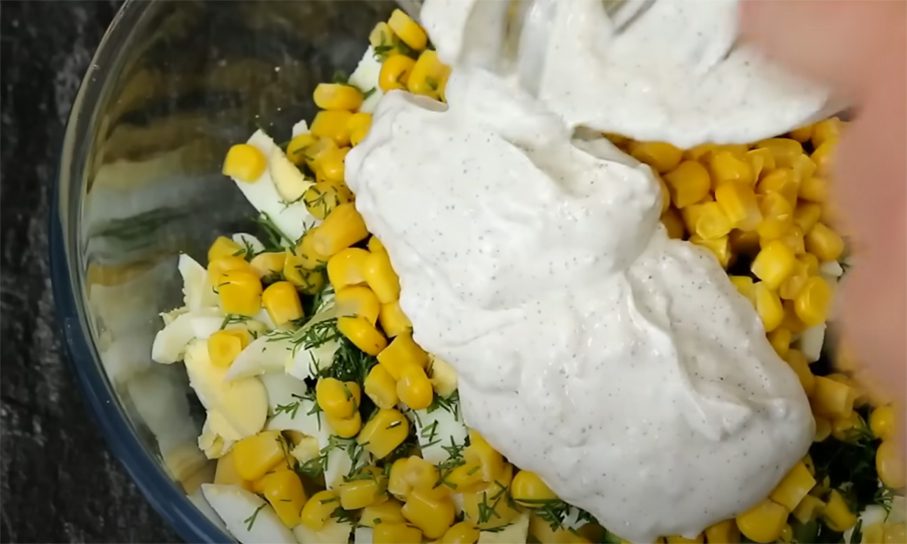 Кріп подрібніть і додайте у салатницю. Туди ж покладіть консервовану кукурудзу. Сметану змішайте з вичавленими крізь прес зубцями часнику. Посоліть, поперчіть, перемішайте. Заправте салат і можете подавати до столу.