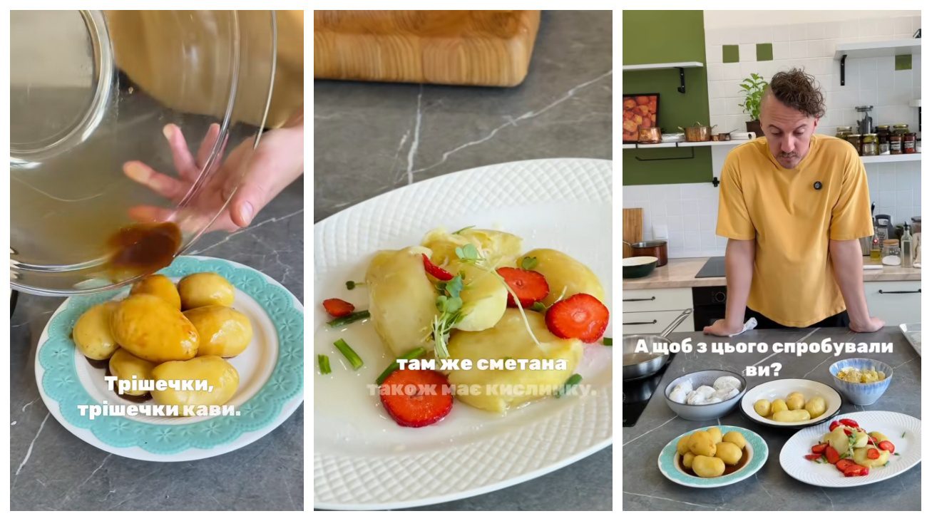 “Просто картопля, а зверху — полуниця! Вона має гарний колір, гарний смак кислинки. А якщо ми їмо картоплю зі сметаною, там же також є кислинка. Так”, – підкреслив шеф-кухар.