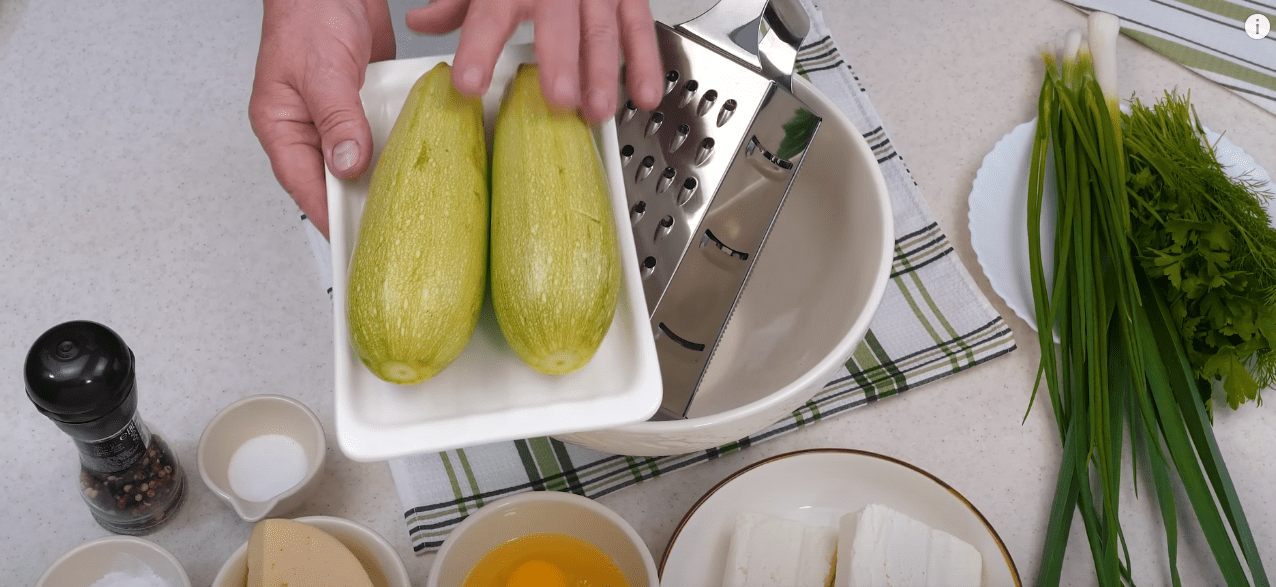 Два кабачки натираємо на великій тертці. Якщо вони перезрілі, то обрізаємо шкірку та видаляємо насіння. Присипаємо сіллю, перемішуємо та залишаємо на 10 хвилин у спокої, щоб вони пустили сік.