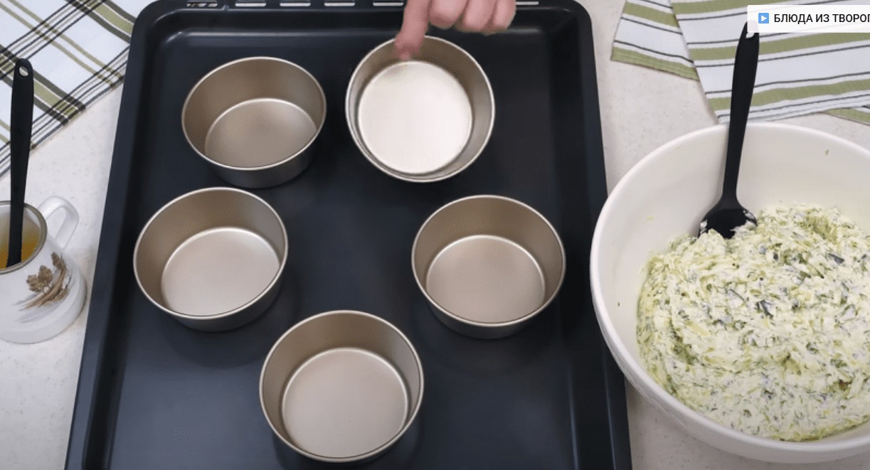 Підготовлену масу перекладаємо у форму. Можна приготувати порційні. Змащуємо їх маслом і розкладаємо масу порівну, не доходячи до краю приблизно 1 см.