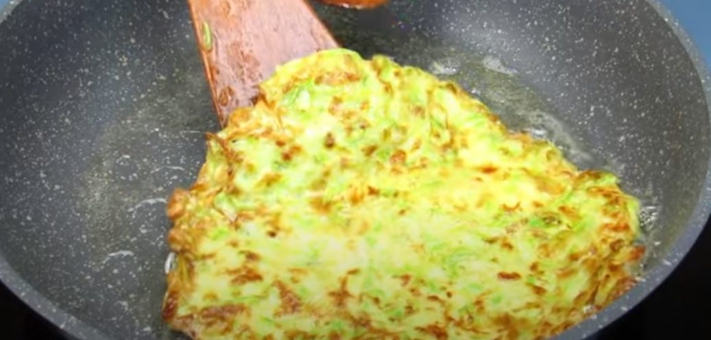 Розділіть кабачкове тісто на 5 частин. З кожної підсмажте млинець на ширину пательні, швиденько розправивши лопаткою. Смажте на середньому вогні до появи рум’яної скоринки. Потім переверніть на інший бік.
