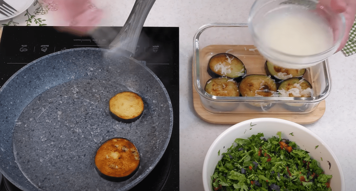 Залишається обсмажити баклажани на невеликій кількості рослинної олії до золотистої скоринки.