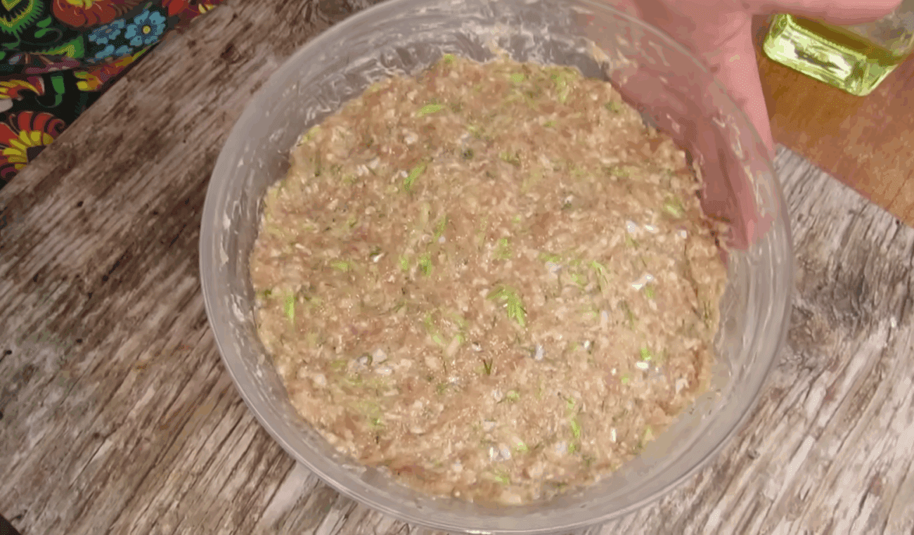 З кабачка відтискаємо сік і м’якоть перекладаємо до курячого фаршу. Дрібно нарізаємо 1 невеликий пучок кропу і також додаємо до фаршу.
