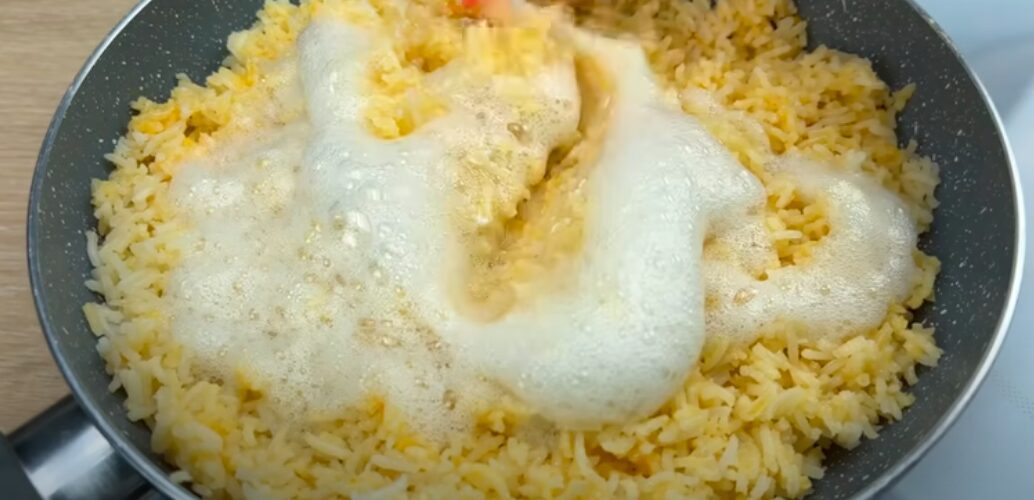 Пишну білкову масу теж перелийте на пательню. Дуже легенько змішайте білки з рисом. Дайте дійти до кондиції ще 2 хвилини. Все! Дуже поживний та смачний рис готовий. Його можна подати до столу з підсмаженими овочами.