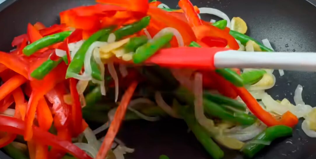 Для цього спочатку на олії підсмажте 2 хвилини нарізані на величенькі шматочки часник та імбир. Після цього додайте на пательню цибулю та стручкову квасолю. Далі – смужки солодкого перцю, бажано червоного кольору, та кукурудзу. Обсмажуйте овочі на середньому вогні.