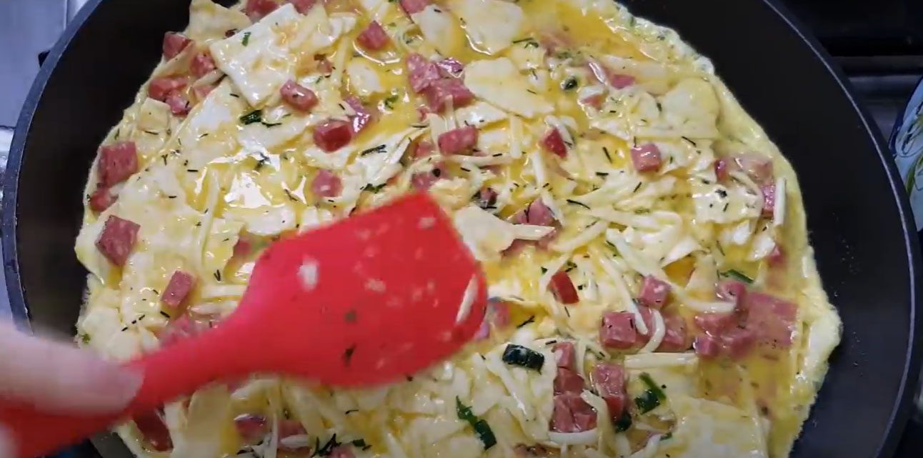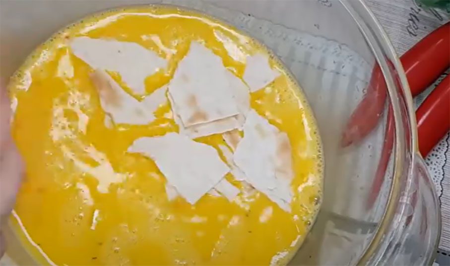 Щоб приготувати швидкий сніданок, вбийте у миску яйця. Влийте молоко та трішки присоліть та поперчіть. Вінчиком перемішайте масу до однорідності. Тонкий лаваш поламайте на невеликі шматочки й додайте до яєчної маси.