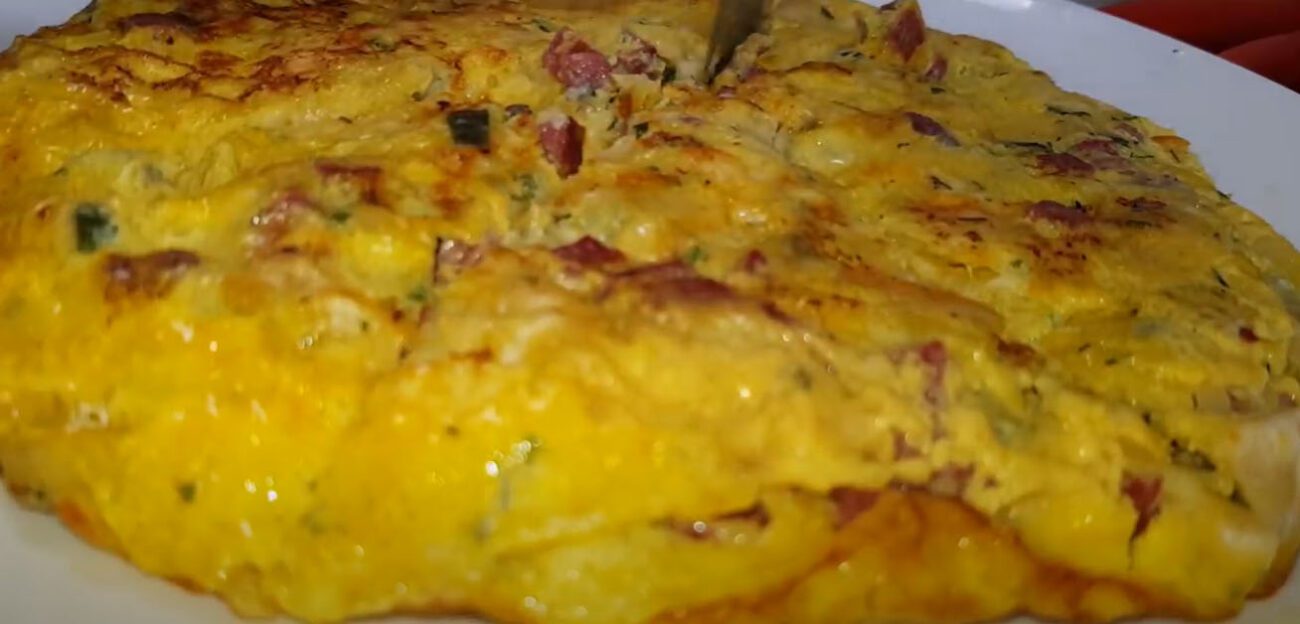 Якщо є бажання, можете замінити ковбасу на варене куряче філе. Зелень петрушки чи зеленої цибулі подрібніть ножем. Всі інгредієнти додайте в одну миску й перемішайте. Тісто для сніданку готове.