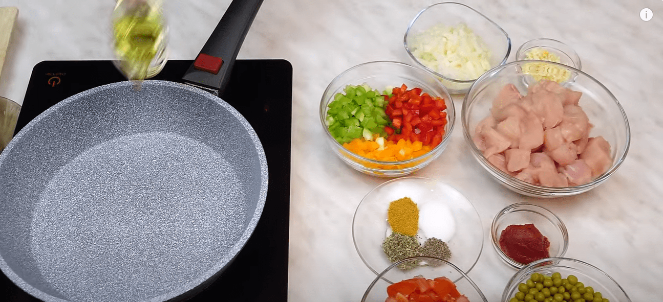 Встановлюємо сковороду на плиту та включаємо максимальне нагрівання. Вливаємо в неї трохи рослинної олії та обсмажуємо велику цибулину, яка була попередньо нарізана дрібними кубиками. Як тільки цибуля злегка підрум’яниться, всипаємо часник, дрібно подрібнений ножем. Як тільки піде аромат часнику (приблизно через 1 хвилину) додаємо до сковороди солодкий перець, нарізаний дрібними кубиками та томати. Все перемішуємо та обсмажуємо приблизно 2 хвилини.