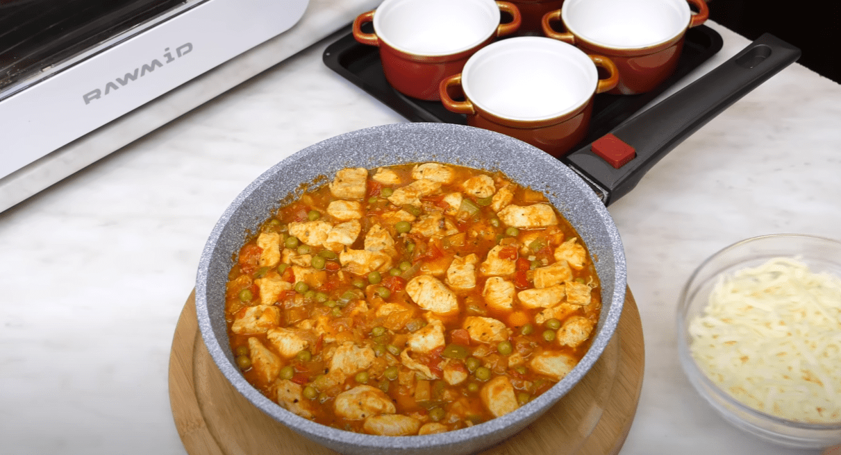 Потім викладаємо у сковороду шматочки курячого філе. Не зменшуючи вогонь, продовжуємо обсмажувати усі продукти. Через 4 хвилини, коли філе набуде білого кольору і зі сковороди випарується весь сік, додаємо сіль, перець, приправи. Туди відправляємо томатну пасту. Все перемішуємо.