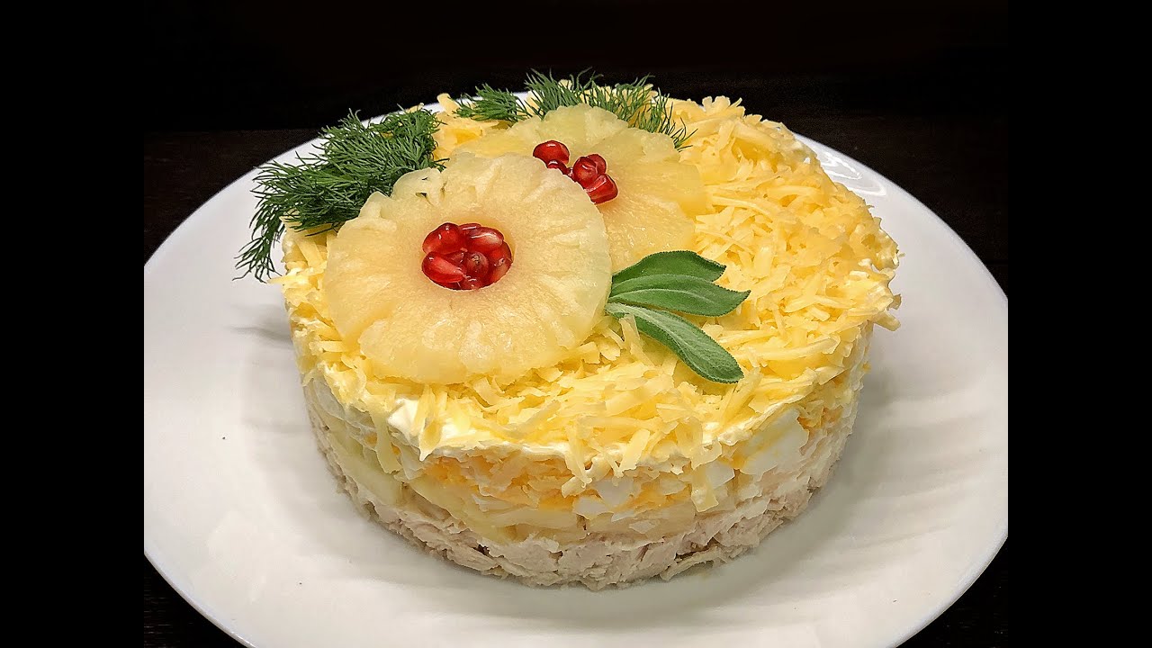 Усі інгредієнти перемішуємо між собою, і для естетичного вигляду посипаємо салат зверху сиром і прикрашаємо шматочками ананасу. Ставимо в холодильник і подаємо на стіл через декілька годин. За бажанням цей салат також можна готувати шарами у кулінарному кільці.