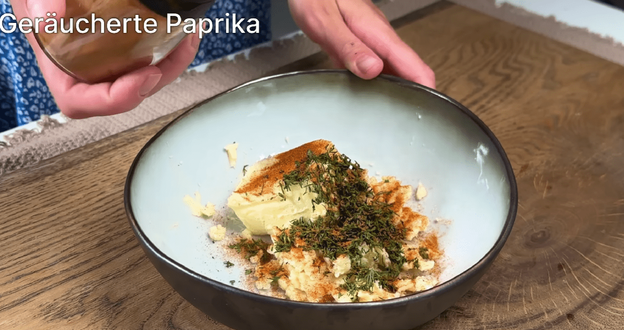 Готуємо начинку. Один плавлений сир перетираємо за допомогою виделки однорідну масу. Додаємо 50 г розм’якшеного вершкового масла, трохи подрібненого кропу і копчену паприку. Все ретельно перемішуємо.