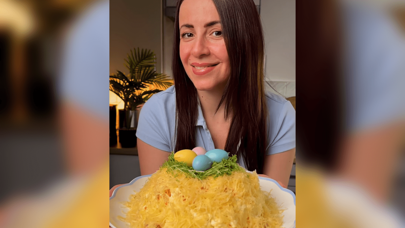 Його особливість у подачі: зверху формується “гніздо” з картоплі, а всередині — ніжна салатна основа та яєчна “начинка”.